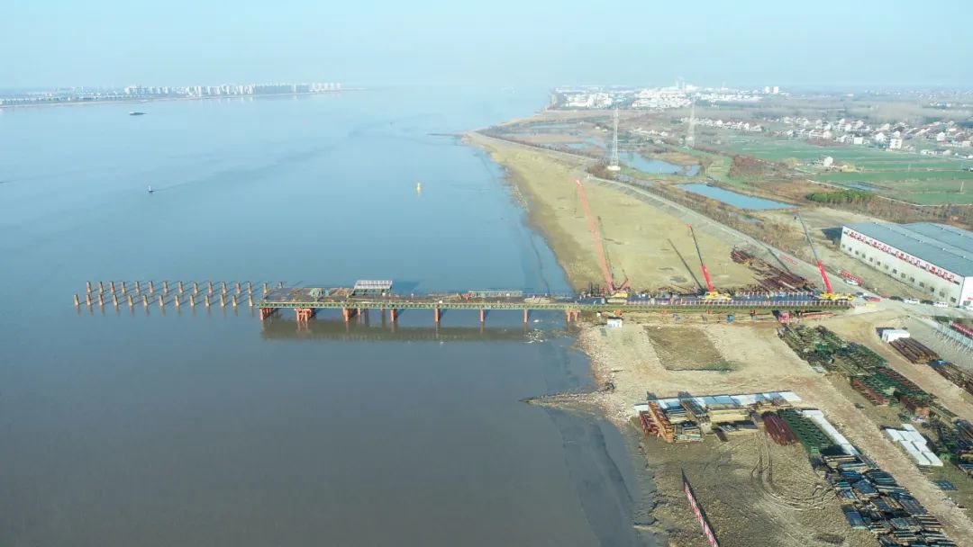 记者了解到,为便于现场施工,桥梁上游侧设有主栈桥1座,联通各个桥墩,南岸主栈桥设计长度1407米,目前已施工完成417米。北岸205米栈桥已经全部施工完成。