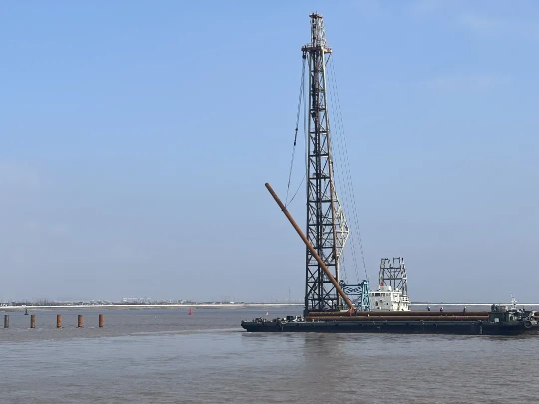 11日,北沿江高铁崇启公铁长江大桥施工现场,几艘作业船停靠在旁,随着一根根钢管桩缓缓没入水中,水上施工有序铺开。