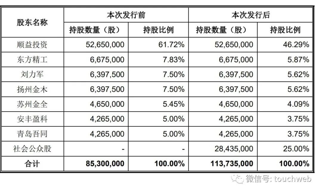 IPO后,顺益投资持股46.29%,东方精工持股5.87%,刘力军、扬州金木分别持股5.62%,苏州金全持股4.09%,安丰盈科、青岛吾同分别持股3.75%。