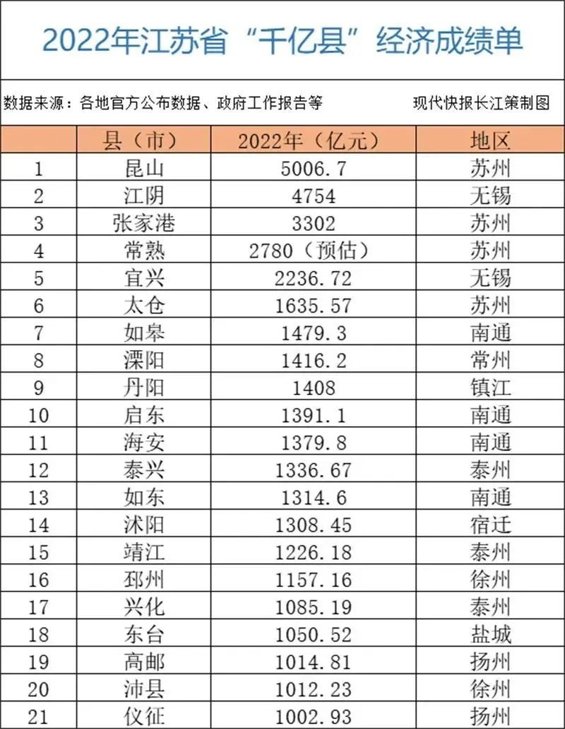 据现代快报消息,近日,江苏各地2022年GDP数据陆续公布。除了昆山成为全国首个GDP突破5000亿元的县级市外,东台、高邮、沛县、仪征2022年GDP也首次突破千亿大关,江苏“千亿俱乐部”县市成员增加到21个。