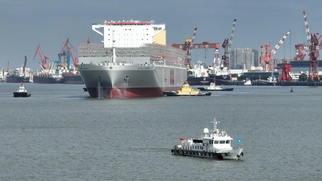 据了解,南通中远海运川崎共承接了6艘2.4万标箱常规动力集装箱船和7艘2.4万标箱甲醇双燃料动力集装箱船,是中国造船史上具有行业代表意义的高技术、高附加值的船舶建造订单,对提升江苏省、南通市船舶工业的影响力有着重要的意义。此次试航船舶为南通中远海运川崎首制2.4万标箱集装箱船,后续还将有多艘船舶下水。