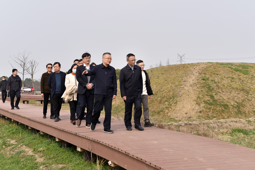 在本体保护展示工程现场,唐炜充分认可了将鸿山国家考古遗址公园打造为郊野公园的定位、理念,对遗址本体保护建成区采取的原状保护、覆土保护、竹罩保护三种保护方式表示肯定,并体验了独具乡野气息的参观路线和游人步道。