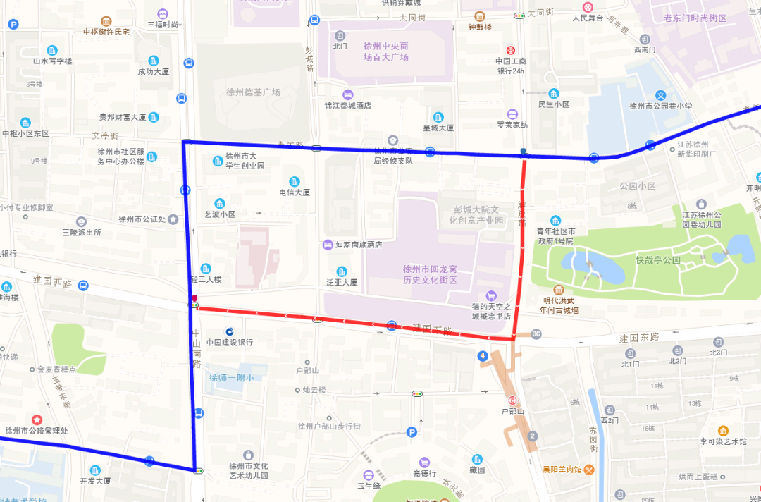 46路沿彭城路行驶至彭城路与青年路交叉口,临时向南绕行,经建国路、解放路至青年路恢复原线路。