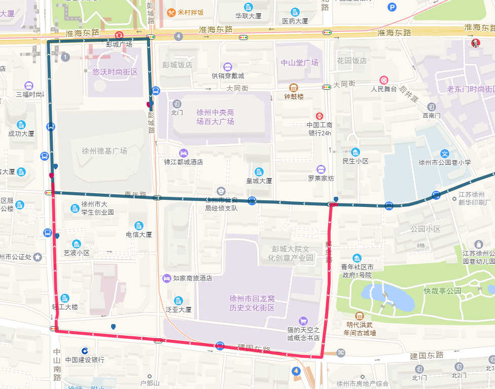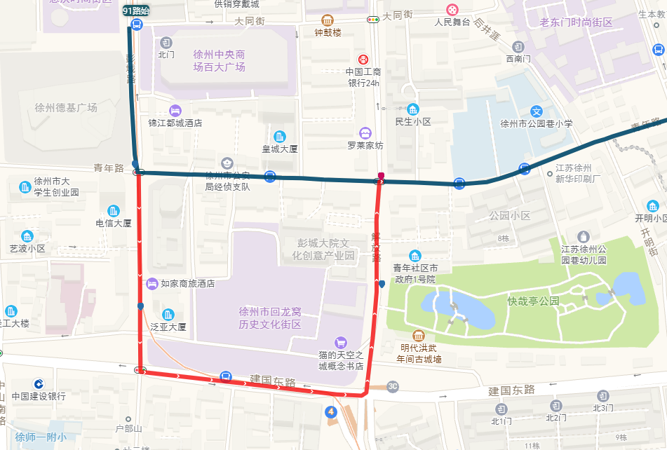 91路沿彭城路行驶至彭城路与青年路交叉口,临时向南绕行,经建国路、解放路至青年路恢复原线路