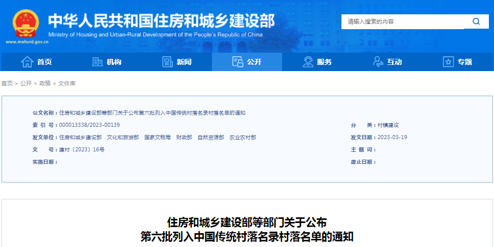 按照《住房和城乡建设部办公厅等关于做好第六批中国传统村落调查推荐工作的通知》(建办村函〔2022〕271号)要求,经各地推荐、专家评审并向社会公示,住房和城乡建设部、文化和旅游部、国家文物局、财政部、自然资源部、农业农村部决定将北京市房山区史家营乡柳林水村等1336个村落(名单见附件)列入中国传统村落名录,现予以公布。