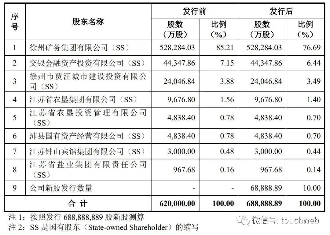 IPO后,徐州矿务集团有限公司(SS)持股为76.69%,交银金融资产投资有限公司(SS)持股为6.44%,徐州市贾汪城市建设投资有限公司(SS)持股为3.49%,江苏省农垦集团有限公司(SS)持股为1.4%;
