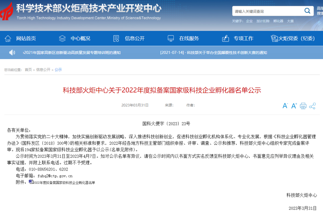 科技部火炬中心公布了