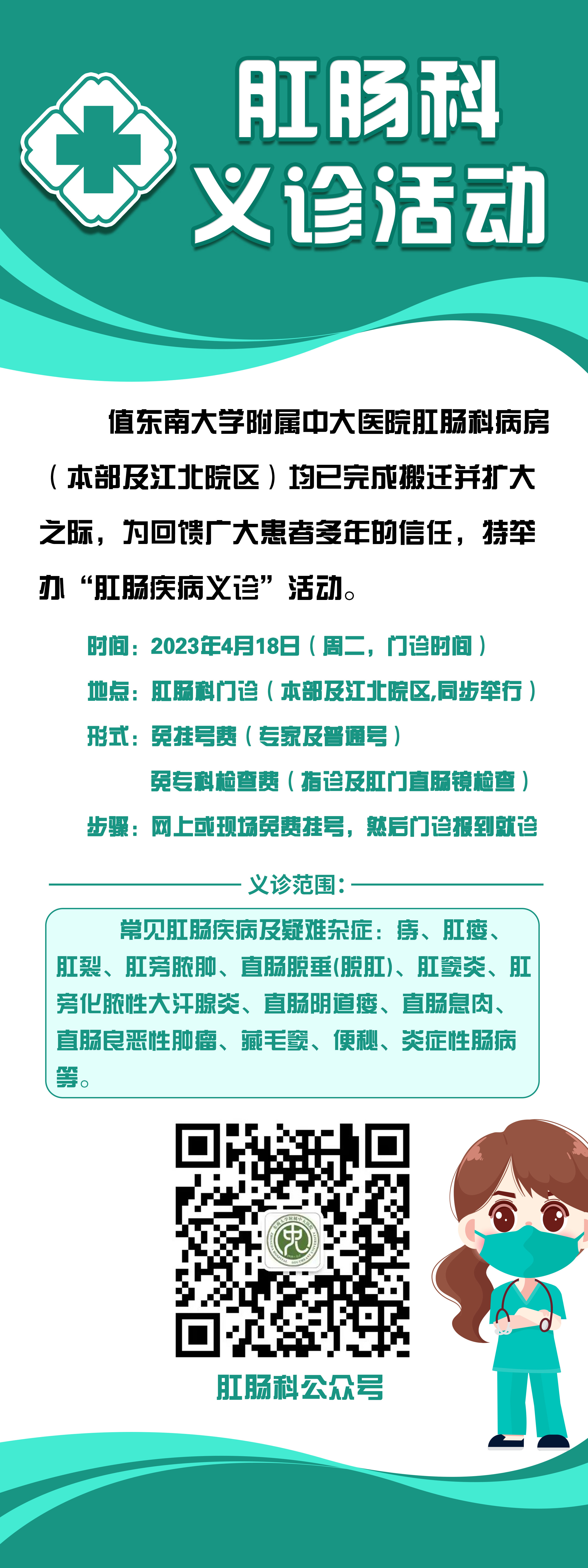 4月18日上午8:00-12:00,下午14:00-17:30,在中大医院本部和江北院区一院两区的肛肠科门诊同步进行义诊。届时,中大医院肛肠科团队将为市民围绕常见肛肠疾病及疑难杂症,如痔、肛瘘、肛裂、肛旁脓肿、直肠脱垂(脱肛)、肛窦炎、肛旁化脓性大汗腺炎、直肠阴道瘘、直肠息肉、直肠良恶性肿瘤、藏毛窦、便秘、炎症性肠病等疾病进行义诊咨询服务。义诊当天免专家及普通门诊挂号费,同时免指诊及肛门直肠镜检查的专科检查费。需要注意的是,前来参加义诊的市民,需在“东南大学附属中大医院”公众号预约挂号或现场免费挂号后,到相应诊室报到就诊。(刘敏 程守勤)