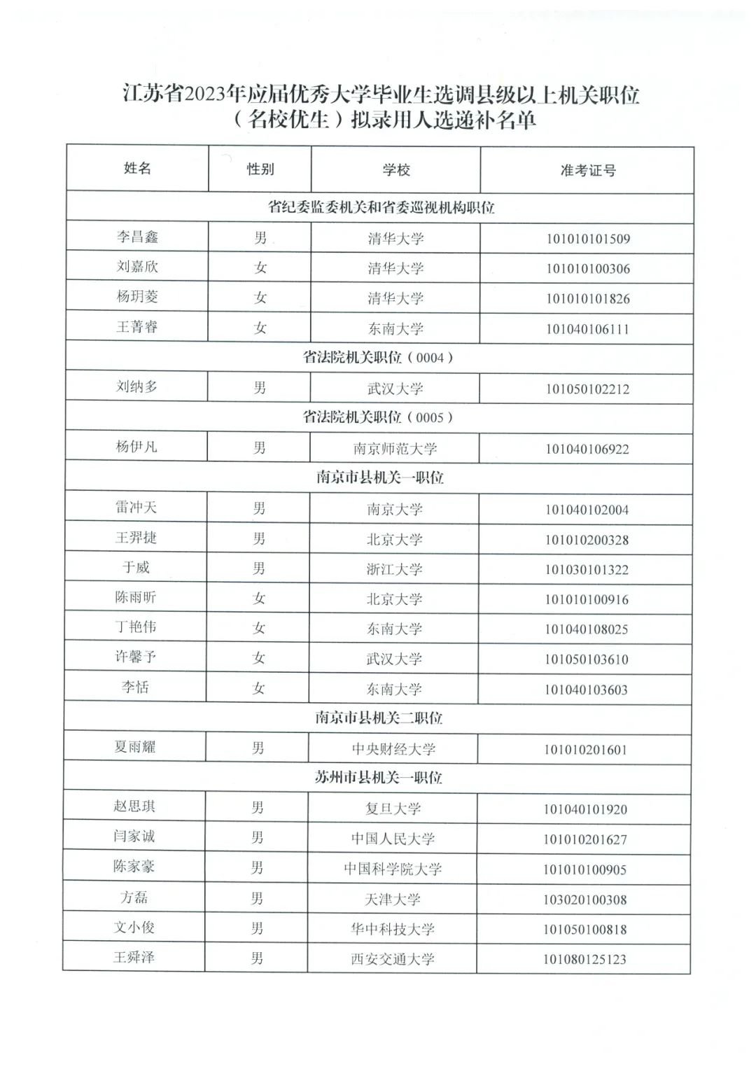 附件:江苏省2023年应届优秀大学毕业生选调县级以上机关职位(名校优生)拟录用人选递补名单
