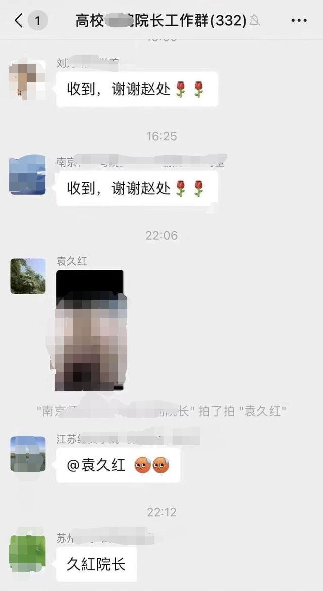 此前,一则关于东南大学一院长在工作群里发“色情照”的消息在网上引发关注。通过网传疑似微信群聊天截图上看到,该群名为“高校马院院长工作群”,群成员有332人。一个群昵称为“袁久红”的人在22时06分发布了一张“色情照片”。随后,有人“拍了拍”“袁久红”,也有人@“袁久红”,并配上了尴尬的表情,似乎是在提醒他发布了不合适的内容,但网传截图上“袁久红”并未撤回发出的图片。
