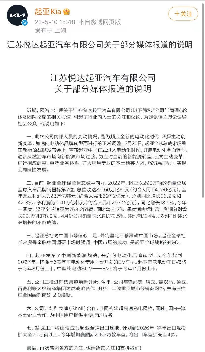 5月10日,江苏悦达起亚汽车有限公司(以下简称悦达起亚)针对近期管理岗轮休及团队收缩的相关报道回应称,此次起亚内部人员的变动情况,是起亚为顺应全新的电动化时代,积极主动创新变革,加速向电动化品牌转型而进行的正常调整。