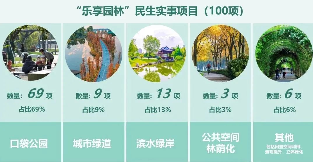 “建设100处‘乐享园林’活力空间”自2022年起连续两年纳入省政府民生实事,重点推进口袋公园、城市绿道、公共空间林荫化滨水绿岸等建设,从完善园林绿地空间体系、提升多元功能及服务水平、推进共治共建共享等方面入手,为群众营造更多可休憩、可健身、可交往的高品质绿色空间,更好满足群众对美好生活的向往。