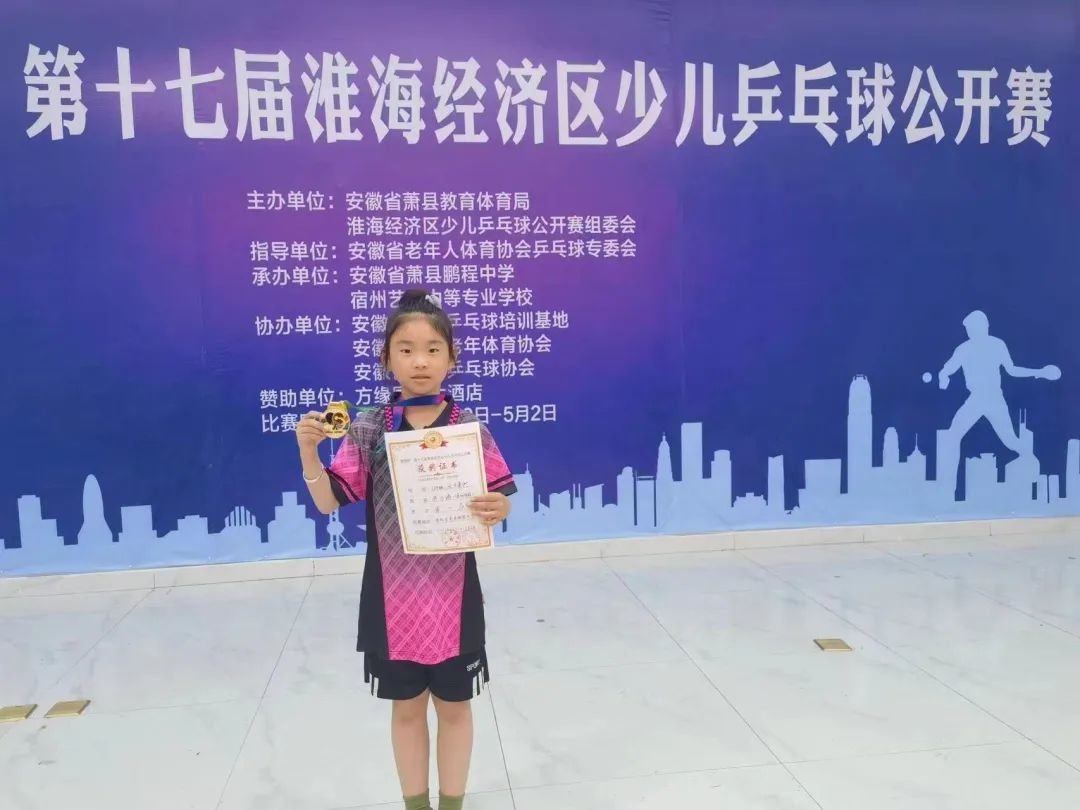 徐州市青年路小学二(5)班学生冯子洛在“鹏程杯”第十七届淮海经济区少儿乒乓球公开赛中成功夺得了8岁组女子单打冠军。