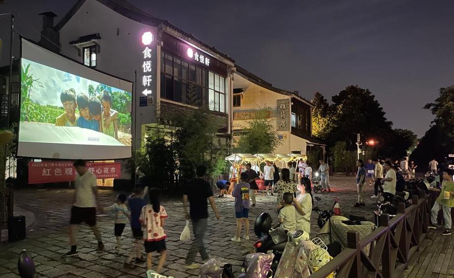 新华网南京6月30日电(记者刘巍巍)近日,一场别具一格的“红色观影·舒享夜市”主题集市活动在苏州市姑苏区吴门桥街道兴隆桥社区吴门印象商圈举行,吸引众多居民前来观影,成为夏夜一道美丽的风景线。