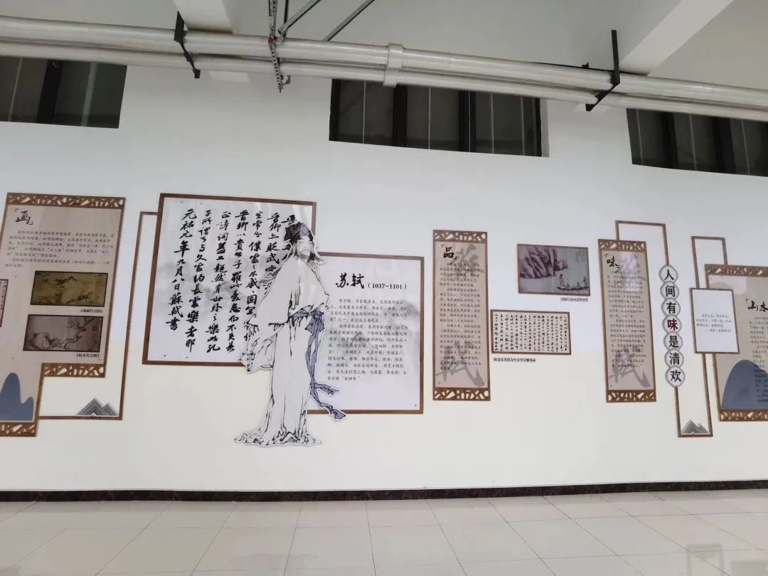 盛夏缤纷花草的掩映中,校园内苏轼文化广场也早已落成,孩子们在这里阅读、游戏、休憩,东坡先生的雕像映衬着题满了诗词的文化墙壁,陪伴着学生们读书、问道、成长。学校的报告厅外,以苏轼的生平资料、诗词作品为素材组成的“苏轼文化长廊”也备受师生青睐,长廊还专门设置了作品展示区,成了师生交流苏词、分享感悟、展现自我的舞台。