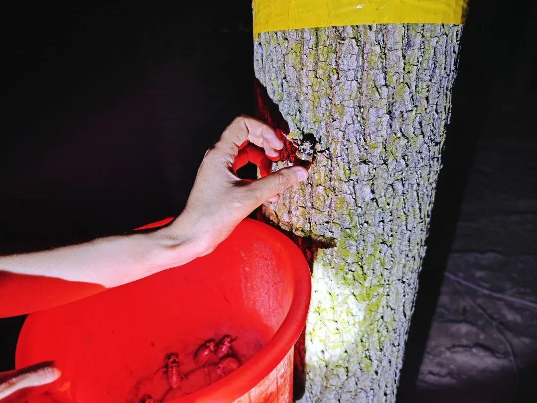 临近晚上八点,凤城街道果园村畔的大片树林里人气爆棚。手拿电灯、手提水桶,村民们三五成群,捕捉刚从地下钻出的金蝉。