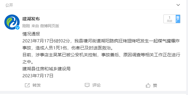 7月17日6时02分,盐城市建湖县塘河街道湖阳路疯狂烤翅烤吧发生一起煤气罐爆炸事故,造成人员1死1伤。伤者已及时送医救治。