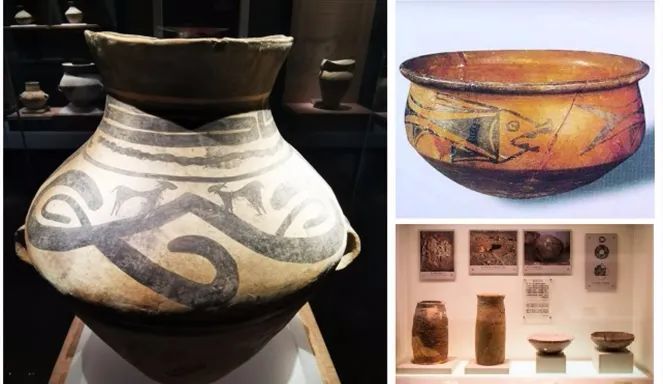 ▲马家窑文化(左)、仰韶文化(右上)及红山文化(右下)彩陶