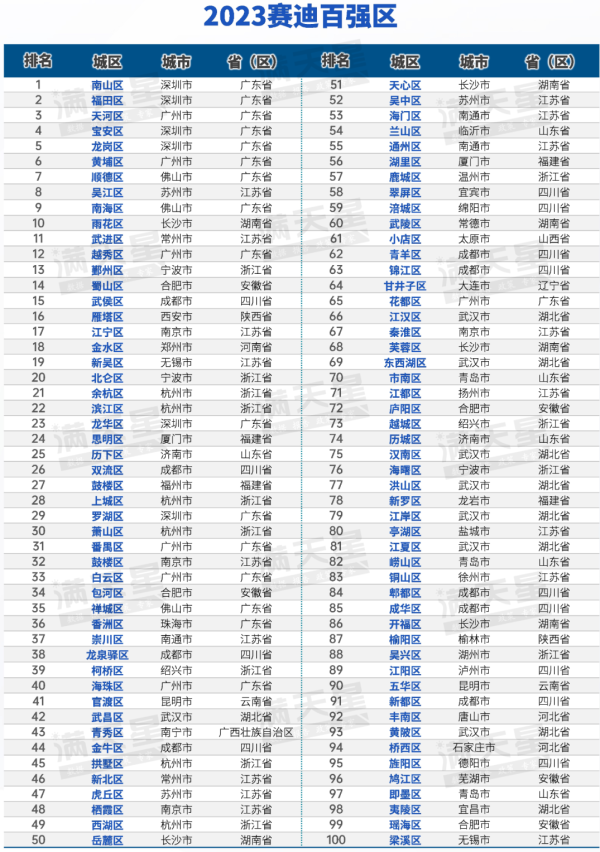 赛迪顾问股份有限公司隶属于工信部中国电子信息产业发展研究院,百强区榜单从经济实力、增长动力、内生支撑、区域能级和共享发展对市辖区进行综合评价。