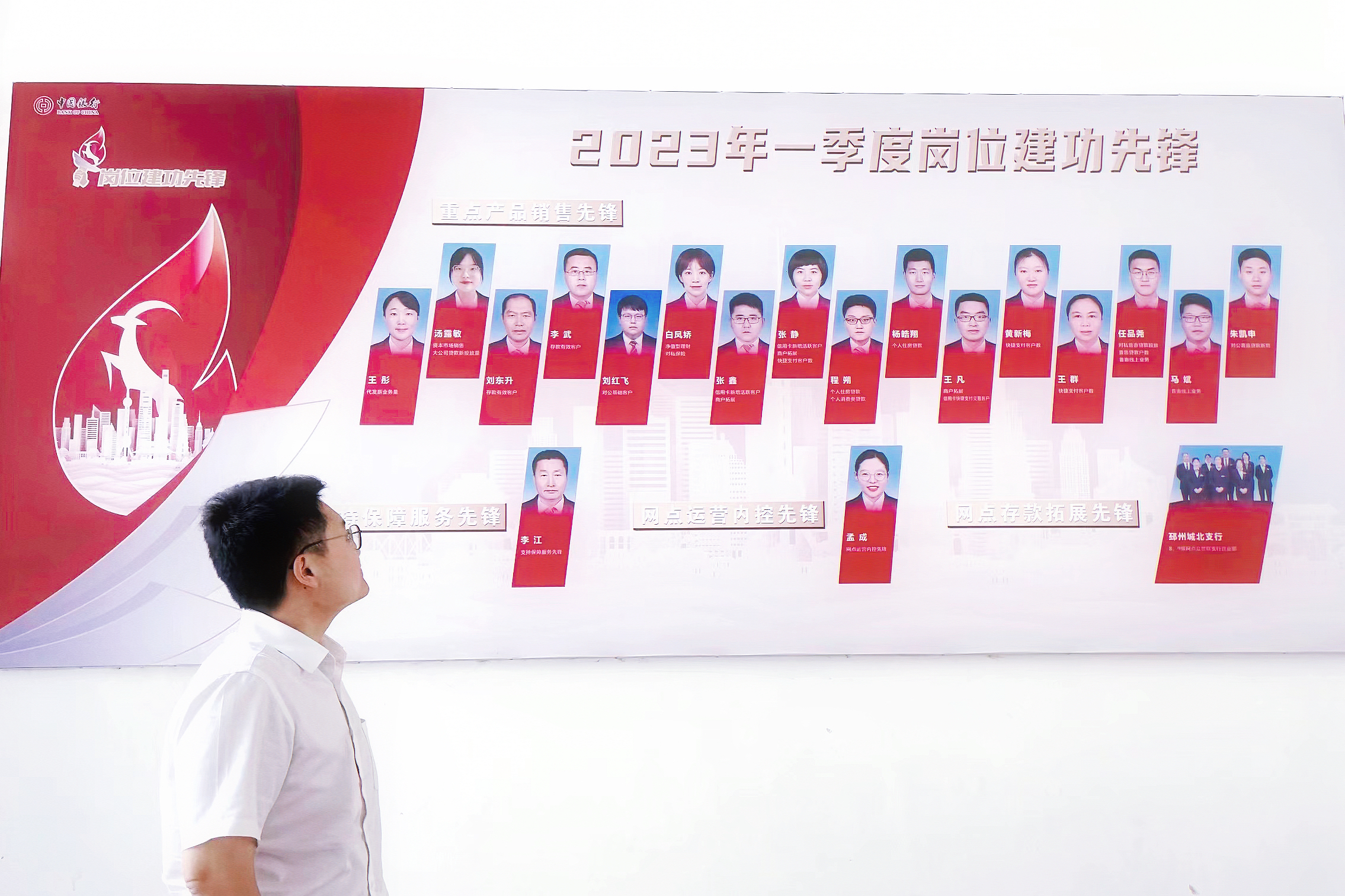今年6月刚刚被提拔为中行淮安盱眙支行营业部主任的潘莉自岗位建功先锋机制推行以来,已囊获10枚荣誉勋章。她曾是精英理财经理,是技能一级能手,是扎根在县域支行一线数十年的个金营销尖兵,因为岗位建功先锋机制,潘莉被发现、被关注、被认可,并闪闪发光。每每路过自己的荣誉墙,她都不由的浑身充满动力,更加笃定了自己前行的方向。在盱眙中行营业部,已有15人累计43人次被评为岗位建功先锋,潘莉说:“我们网点的员工有两类,一种是岗位建功先锋,一种是正在努力成为岗位建功先锋,现在我的目标是要带领全网点人人得先锋,次次得先锋。”