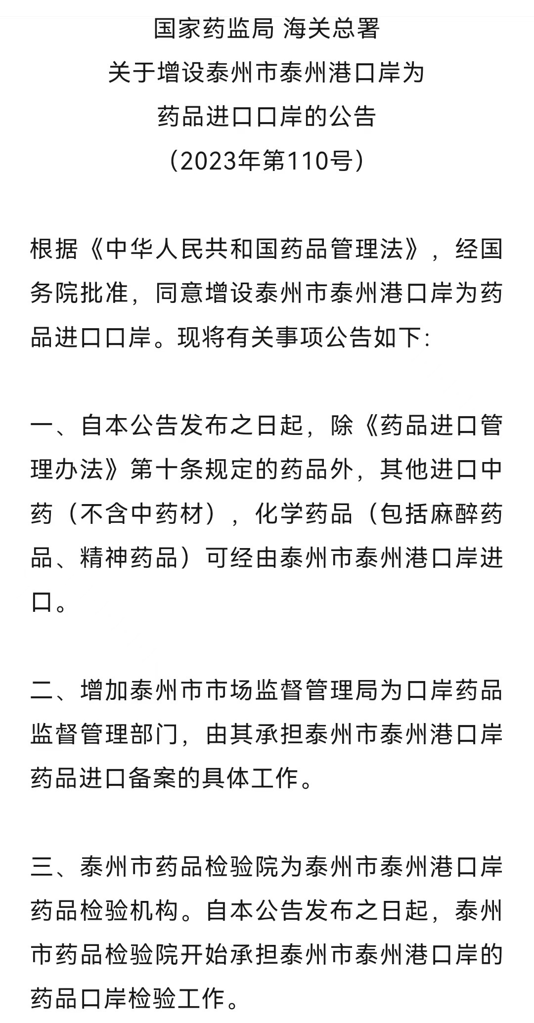 国家药监局、海关总署联合发布的公告还显示,增加泰州市市场监管局为口岸药品监督管理部门,由其承担泰州港口岸药品进口备案的具体工作。泰州市药品检验院为泰州港口岸药品检验机构。自公告发布之日起,泰州市药品检验院开始承担泰州港口岸的药品口岸检验工作。