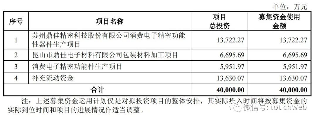鼎佳精密曾计划募资4亿元,1.37亿元用于苏州鼎佳精密科技股份有限公司消费电子精密功能性器件生产项目,6696万元用于昆山市鼎佳电子材料有限公司包装材料加工项目,5952万元用于消费电子精密功能件生产项目,1.36亿元用于补充流动资金。