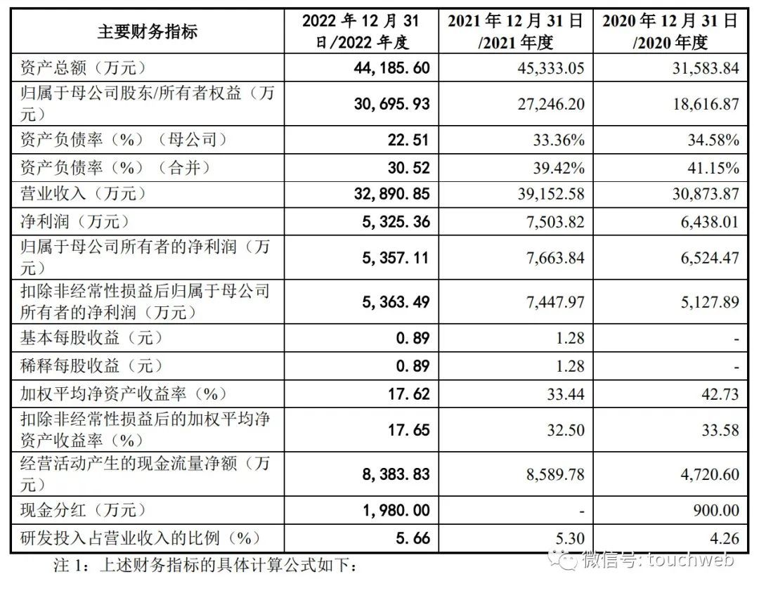 招股书显示,鼎佳精密2020年、2021年、2022年营收分别为3.09亿元、3.92亿元、3.29亿元;净利分别为6438万元、7503.8万元、5325万元;扣非后净利分别为5127.89万元、7448万元、5363.49万元。