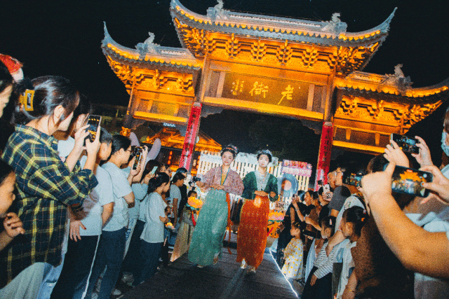 当晚,老街上空上演了一场“花好月圆·国泰民安”无人机灯光秀,400架无人机通过编队表演、高空盘旋等方式,点亮璀璨夜空。