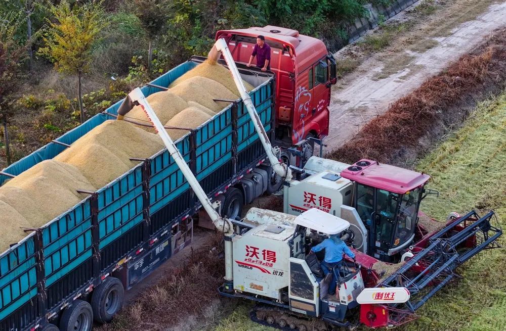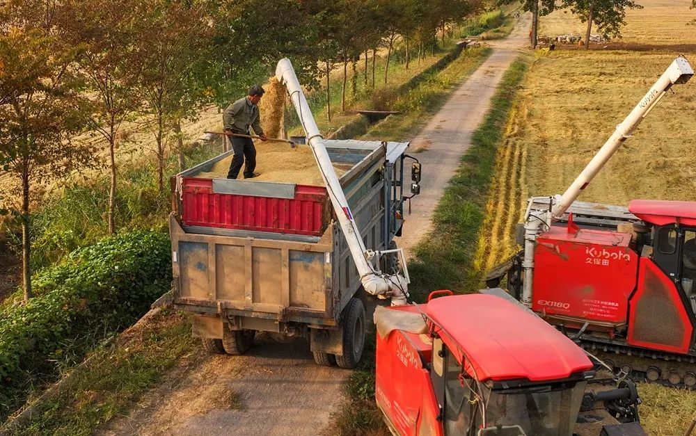 伴随着阵阵轰鸣声,一粒粒稻谷被收入“囊”中。
