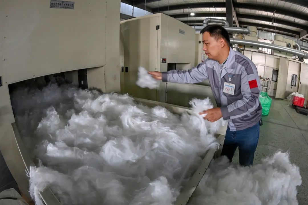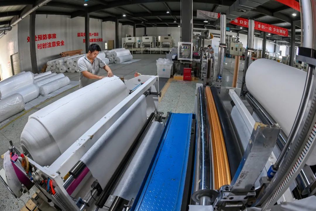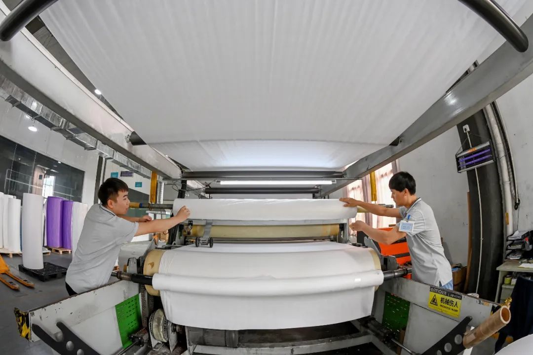 干法、湿法、热压、卷绕、聚合、包装……在功能性针刺无纺布生产车间里,各项工序紧密衔接,所有设备全线运作。“这里生产出的产品一部分是直接销售给客户的,其他的产品还需要到另外车间进行再加工。”车间主任董先生说。在他身后不远处,成垛堆放的无纺布产品将在下午被运输车送往客户手中。