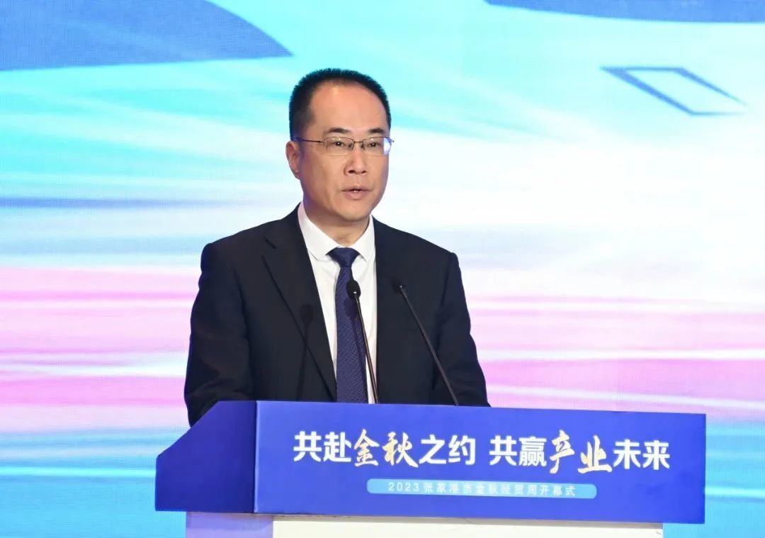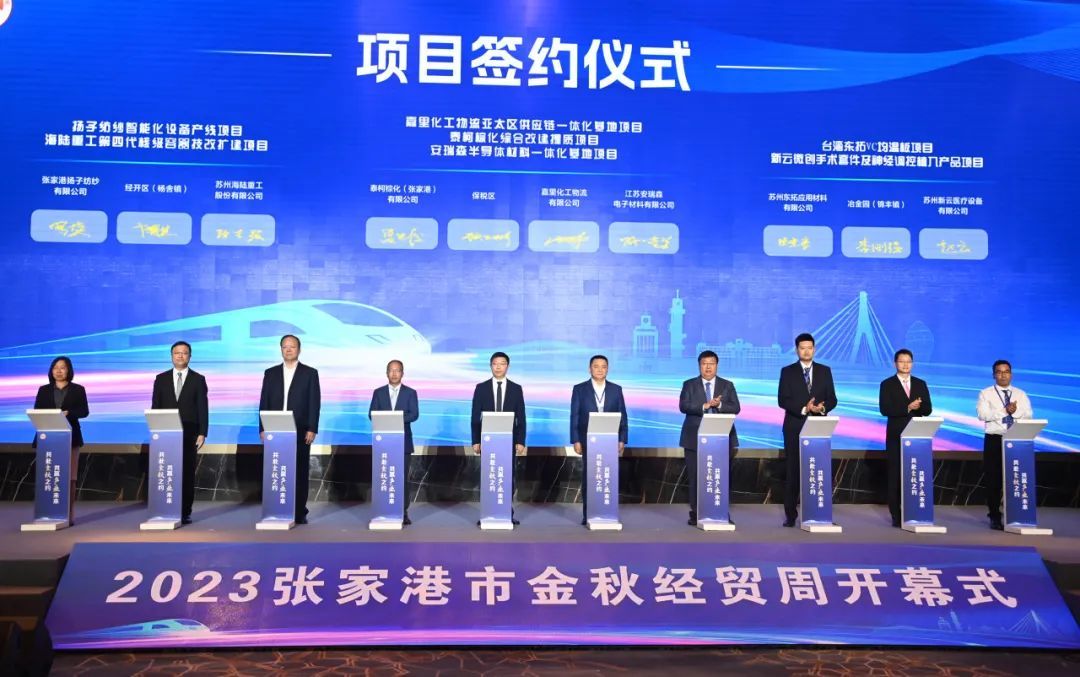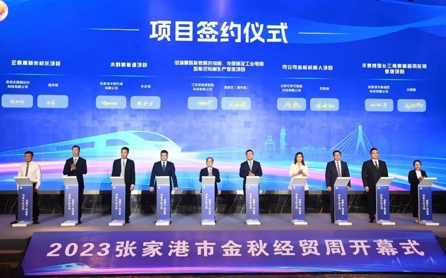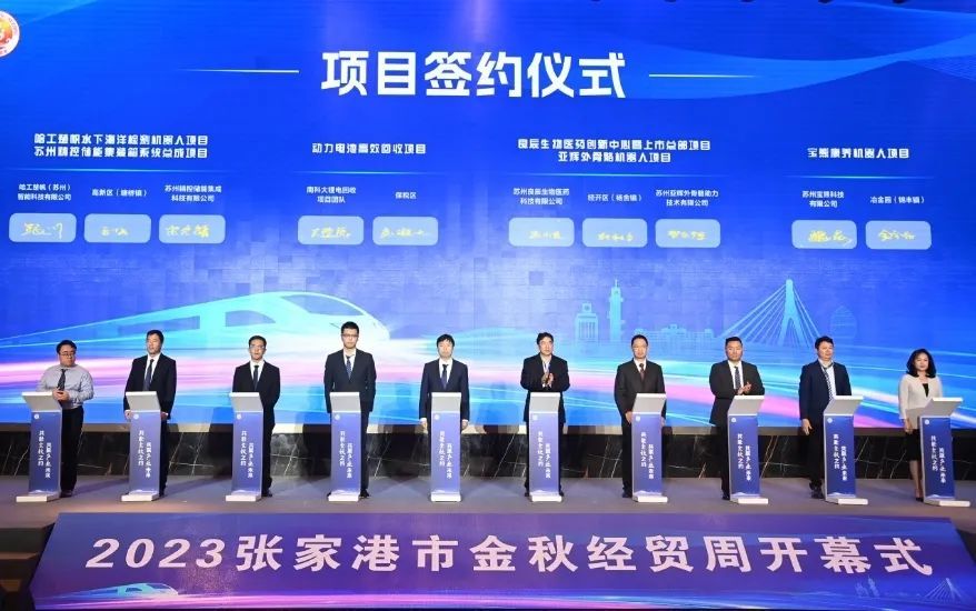 张家港市委书记韩卫在开幕式上致欢迎辞,大族激光副总裁黄祥虎,江苏省储能行业协会会长朱俊鹏出席活动,张家港市委副书记、市长蔡剑峰宣布2023金秋经贸周启动,市领导李炳龙、王亚方、赵建明等参加活动。