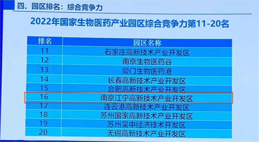 近日,中国生物技术发展中心发布2022年中国生物医药园区发展竞争力排行榜,在全国204个医药园区中,江宁高新区综合竞争力排名第16位,较上年再提升1位,连续4年保持进位,继续为壮大南京市生物医药产业集群贡献江宁力量。