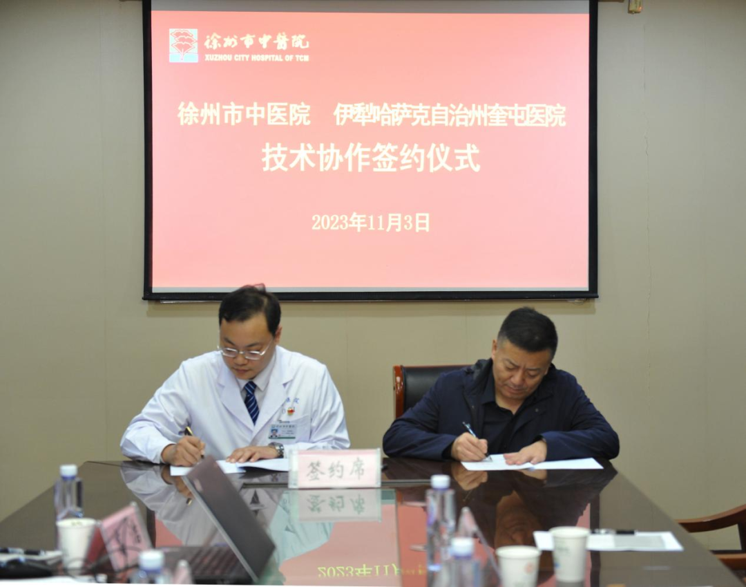 随后,徐州市中医院季培琛副院长和伊犁州奎屯医院莫志强副院长,分别代表两家医院签订了技术协作协议。