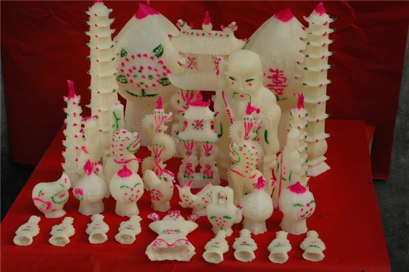 丰县糖人贡以优质白糖为原料,采用梨木模具塑造成形,主要用于丧葬祭祀礼仪。 它题材广泛,涉及社会生活、民间故事、神话传说等丰富的内容,制品有仙佛诸神、 动物、果品、屋宇和器具等多种样式,显示出浓郁的民间信仰色彩。