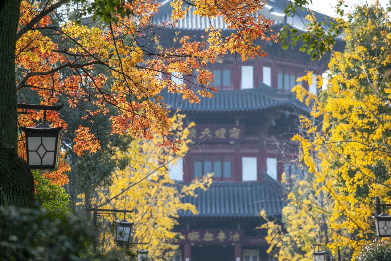 山明水净夜来霜,数树深红出浅黄。当深秋的风吹过虎丘山门高大金黄的银杏树,吹过拥翠山庄墙外层林尽染、灿若云霞的红枫小径,光影间的虎丘山已然美成仙境。