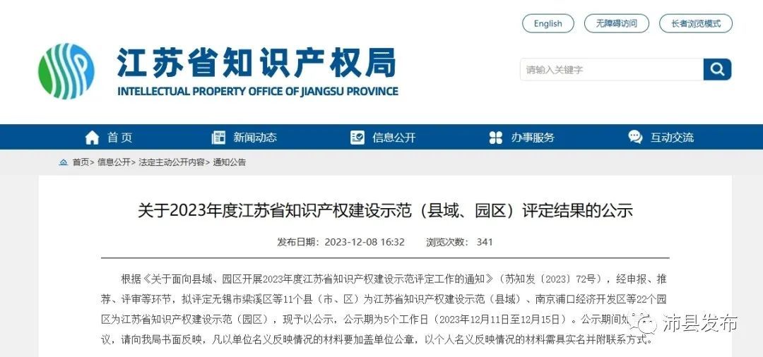江苏省知识产权局发布了