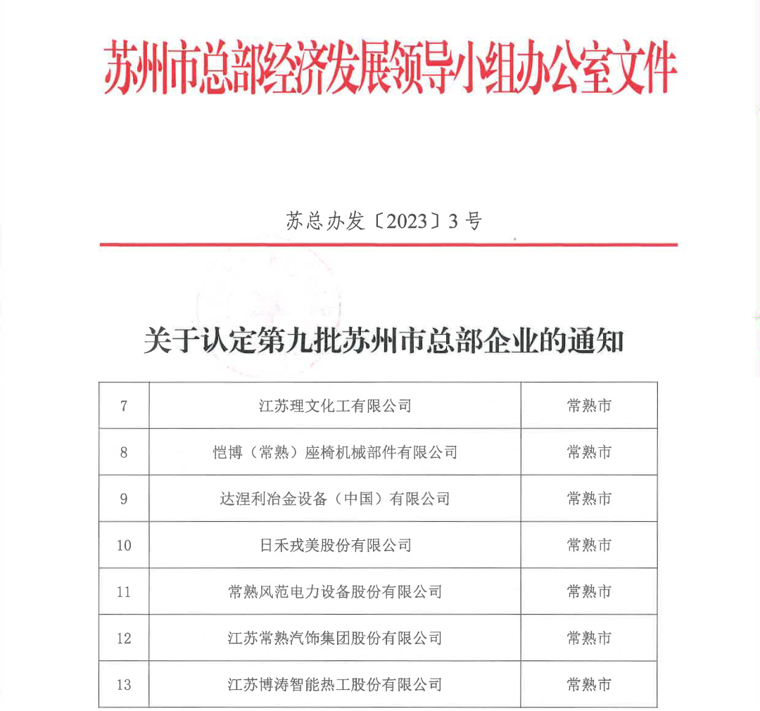 原标题:常熟7家企业获评苏州市总部企业