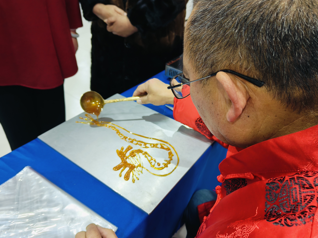 糖画是童年的甜蜜回忆,来自鼓楼区的非遗传承人柴建启用小汤勺舀起熔化了的糖汁飞快地来回浇铸,画出龙的矫然昂首,龙鬃飞洒,随即用小铲刀将糖画铲起,粘上竹签。这一糖画寓意富贵吉祥、福寿绵延,衬托出节日的喜庆气氛。“糖画是地道的民间画种,颇具特色的街市艺术。将龙用糖画形式展现出来,祝福大家龙年如糖画一样甜甜蜜蜜。我们还有草编的‘行龙’,嘴里含着一枚圆珠,龙爪分明、活灵活现。”