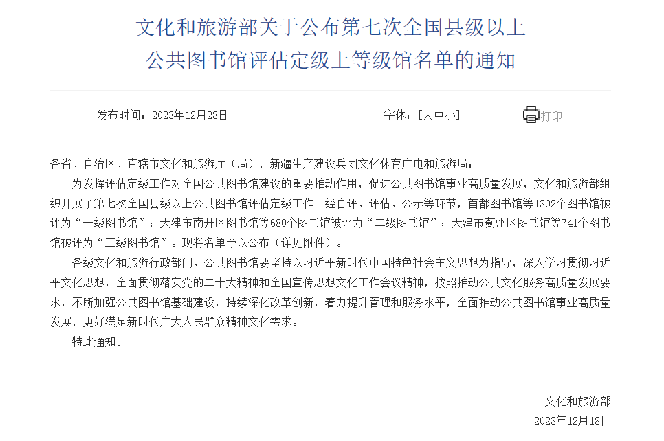 近日,文化和旅游部发布《文化和旅游部关于公布第七次全国县级以上公共图书馆评估定级上等级馆名单的通知》(文旅公共发〔2023〕134号),正式公布了一、二、三级图书馆名单,全国共有1302家图书馆被评为一级图书馆,占全国公共图书馆总数的40.5%。