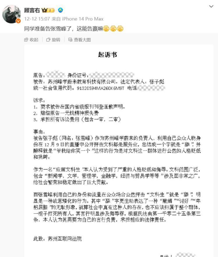 随着事件发酵,2023年12月12日,在某社交平台拥有60余万粉丝的博主“顾言右”就此发布消息称,张雪峰的言论是对文科生群体公然的“人格贬低和挑衅”,欲就张雪峰此前言论将其起诉至法院。