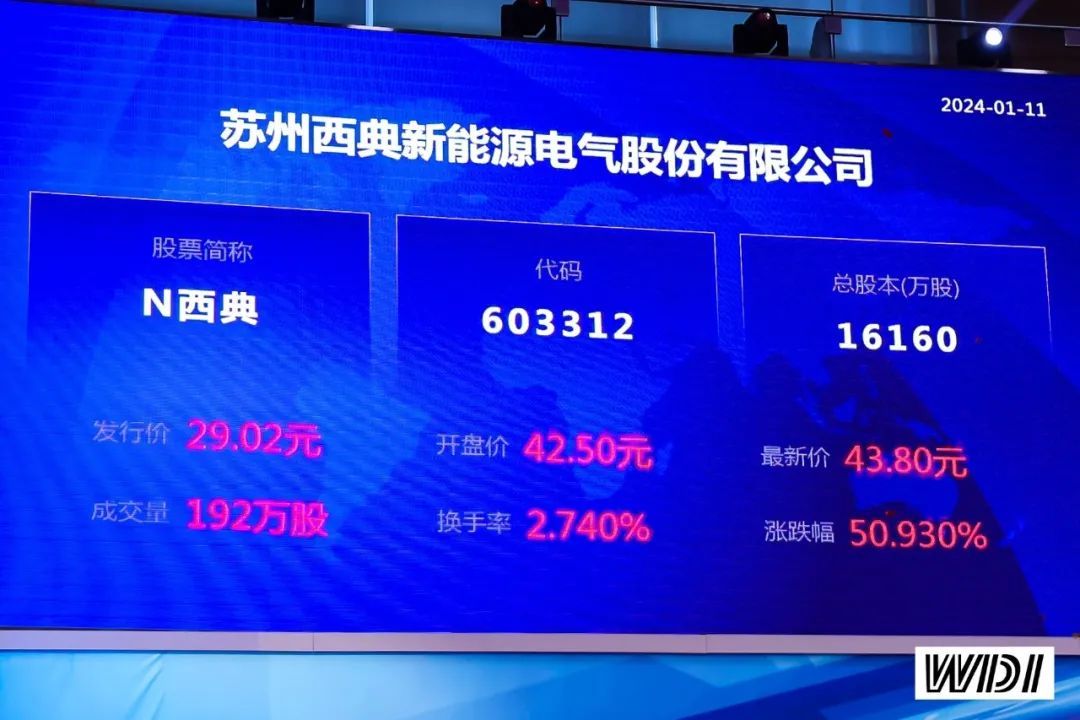 1月11日,苏州西典新能源电气股份有限公司在上海证券交易所主板成功上市,成为今年全省首家A股上市企业,苏州企业上市喜迎2024年“开门红”。