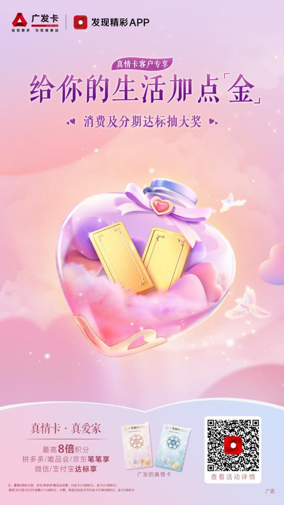 值得一提的是,广发真情卡20多年初心不变,持续以高额福利服务重点客群的消费需求。早在真情卡诞生时,就曾推出办卡送钻石的活动,一度引爆信用卡市场。今年,黄金市场备受关注,广发真情卡推出首次分期达标抽最高50克金条的岁末专宠活动,传承20年前初心,以切实的优惠和福利增强公众的消费能力和消费意愿,以高额奖励促消费循环、以组团分享激发消费潜力,多举措特色营销力促消费,推动消费市场持续升温。
