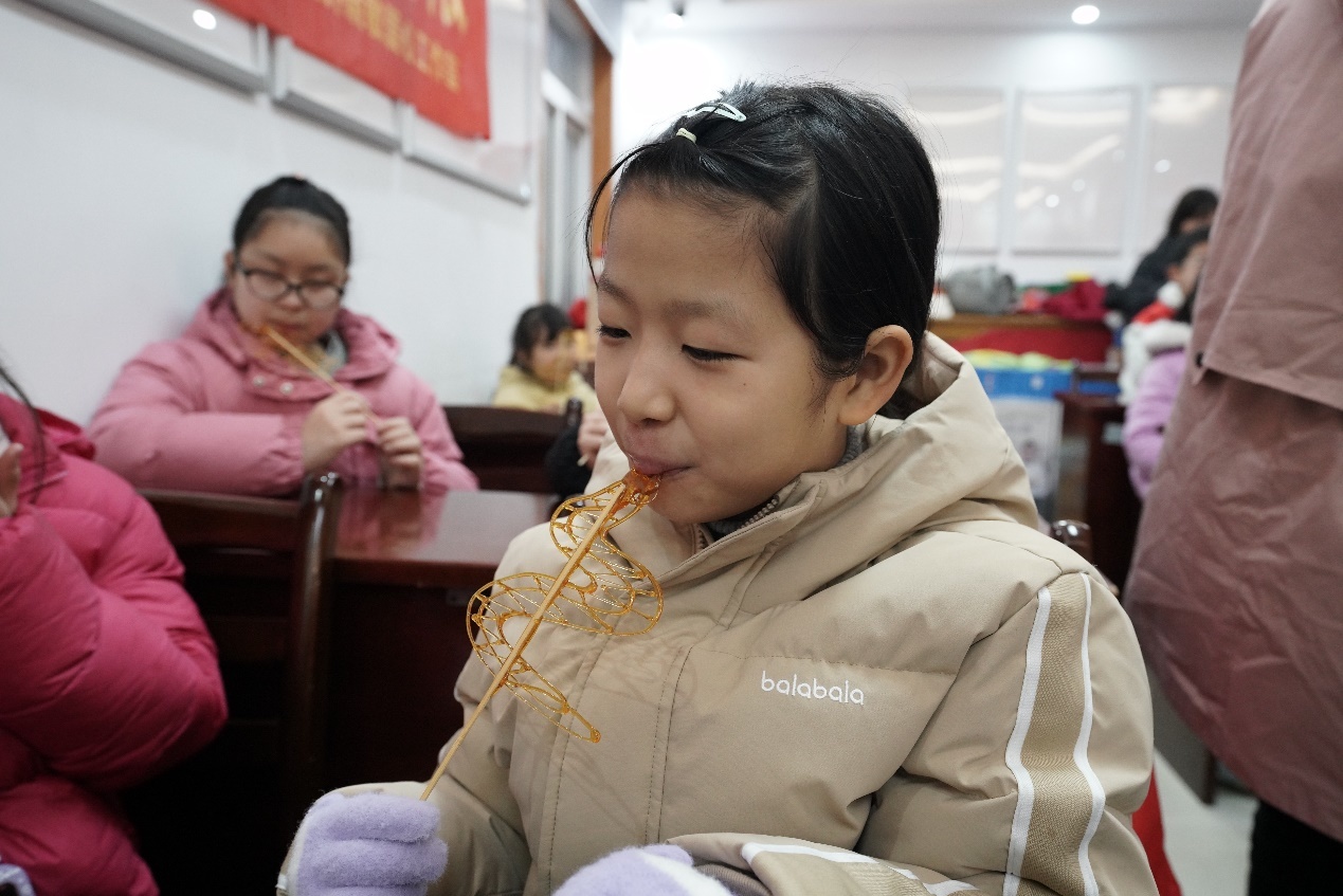 拿到糖画,孩子们迫不及待品尝起来。有个孩子一口咬下去,一块糖画直接掉在桌上,小朋友心疼至及。一名志愿者分享了一个“吃不掉”的秘诀:一口一口轻轻舔。“小时候,家里没什么钱,只有过年的时候,爸爸妈妈才舍得给我和弟弟妹妹买一个糖画,拿到手我们都舍不得一口咬下去。只舍得轻轻舔。”这名志愿者笑着说,一口一口轻轻舔,香甜的味道便溢满整个童年。孩子们听了后,也纷纷伸长舌头,一边舔一边笑,快乐无比。