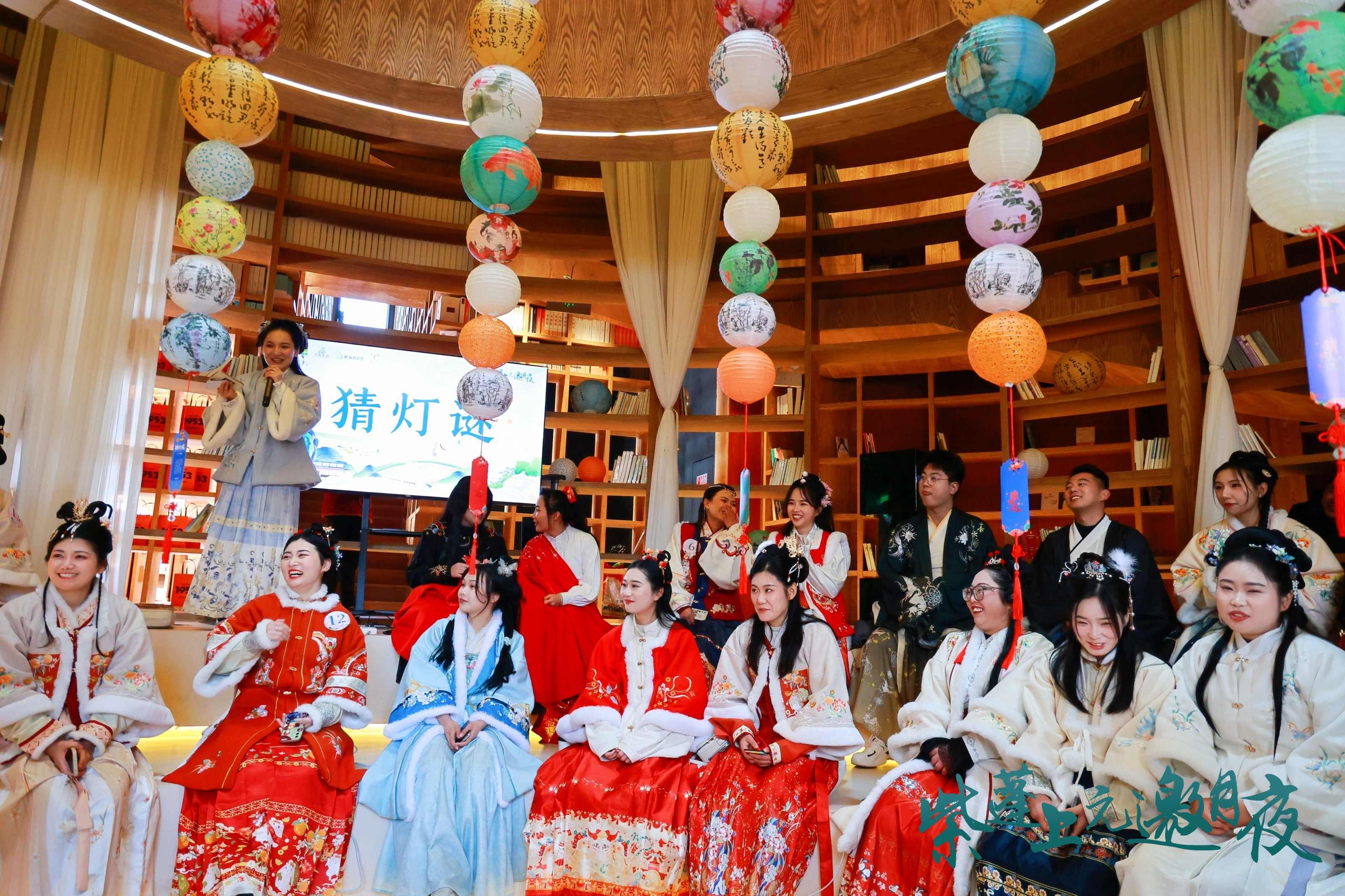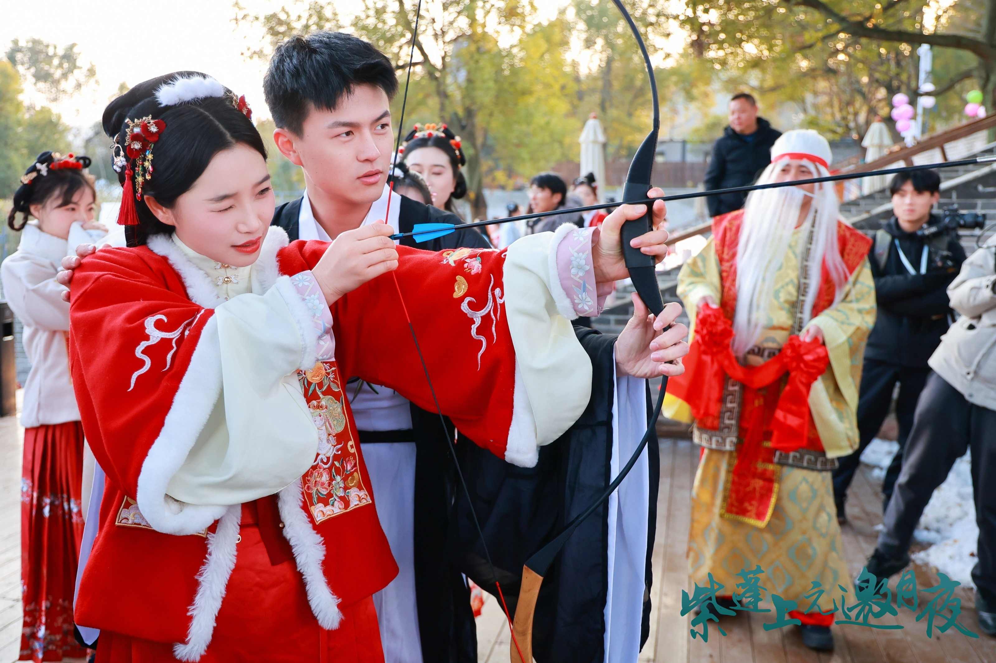 在紫蓬山民宿——聚星粮驿1953,嘉宾们着汉服游园寻缘,现场设置了猜灯谜、飞花令、月老牵线等传统文化类节目,在文史知识的比试里,大家尽展学识与智慧,默契配合、甜蜜互动。
