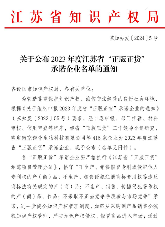 近日,江苏省知识产权局公布了2023年度江苏省“正版正货”承诺企业名单,东台市江苏科华医疗器械科技有限公司等5家企业榜上有名。