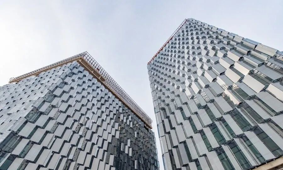 进入施工区域可以看到,三栋建筑的外立面幕墙施工已基本完成。外立面以锯齿状的造型为主要元素,通过三种三角形模块的不同组合,且各层之间形成有波动的韵律,由此最终形成整个外立面的造型,与“破冰”的意象相呼应。