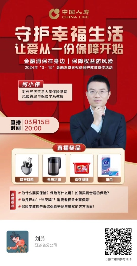 3月15日晚,中国人寿将进行“守护幸福生活,让爱从一份保障开始”直播,向消费者普及保险功用、享有的权益、自身责任与义务,以及如何选择合适的保险产品等。提醒消费者在购买金融产品时,认真阅读合同,了解权利义务,审慎对待合同签署、风险测评等重要环节,增强风险责任意识,树立理性投保观念,真正做到将合适的产品或服务通过合适的渠道提供给合适的消费者。