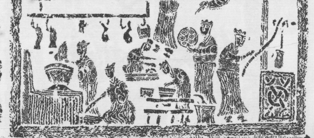 展现庖厨切鱼肉、挂火腿场景的汉画像石拓片(现存徐州睢宁)