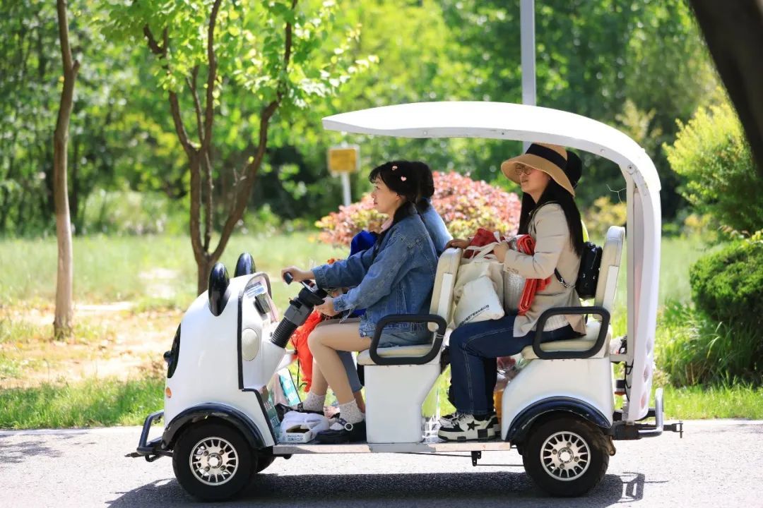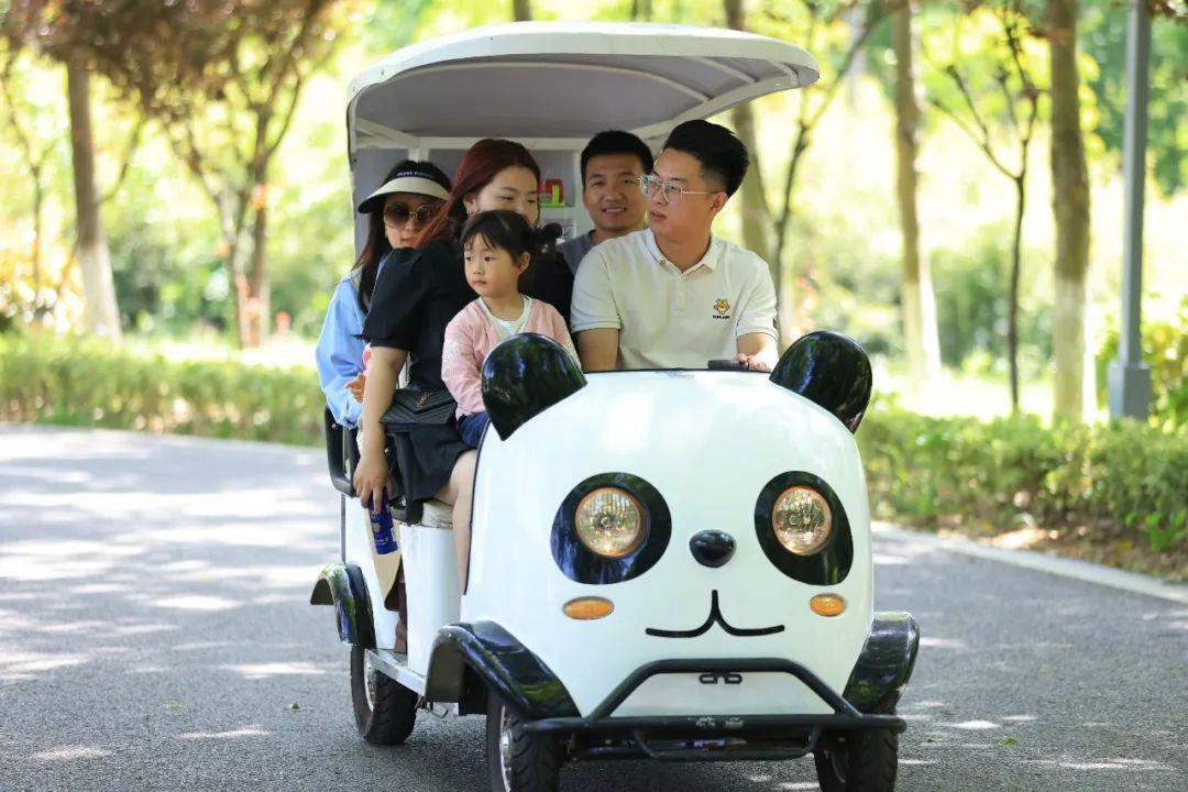 开一辆冰墩墩自助观光车在公园晃悠