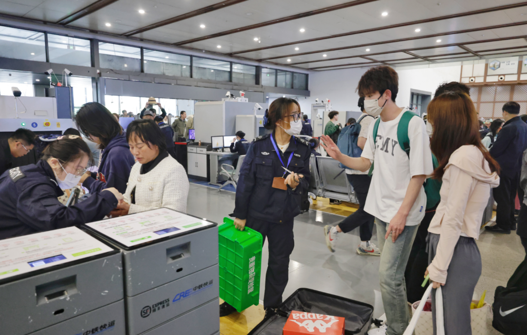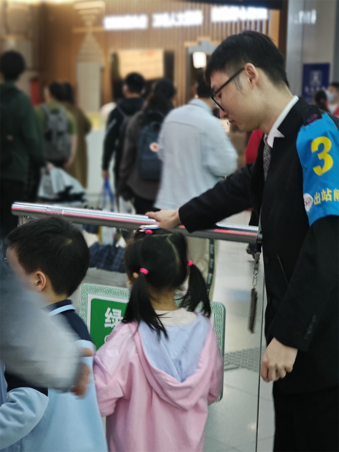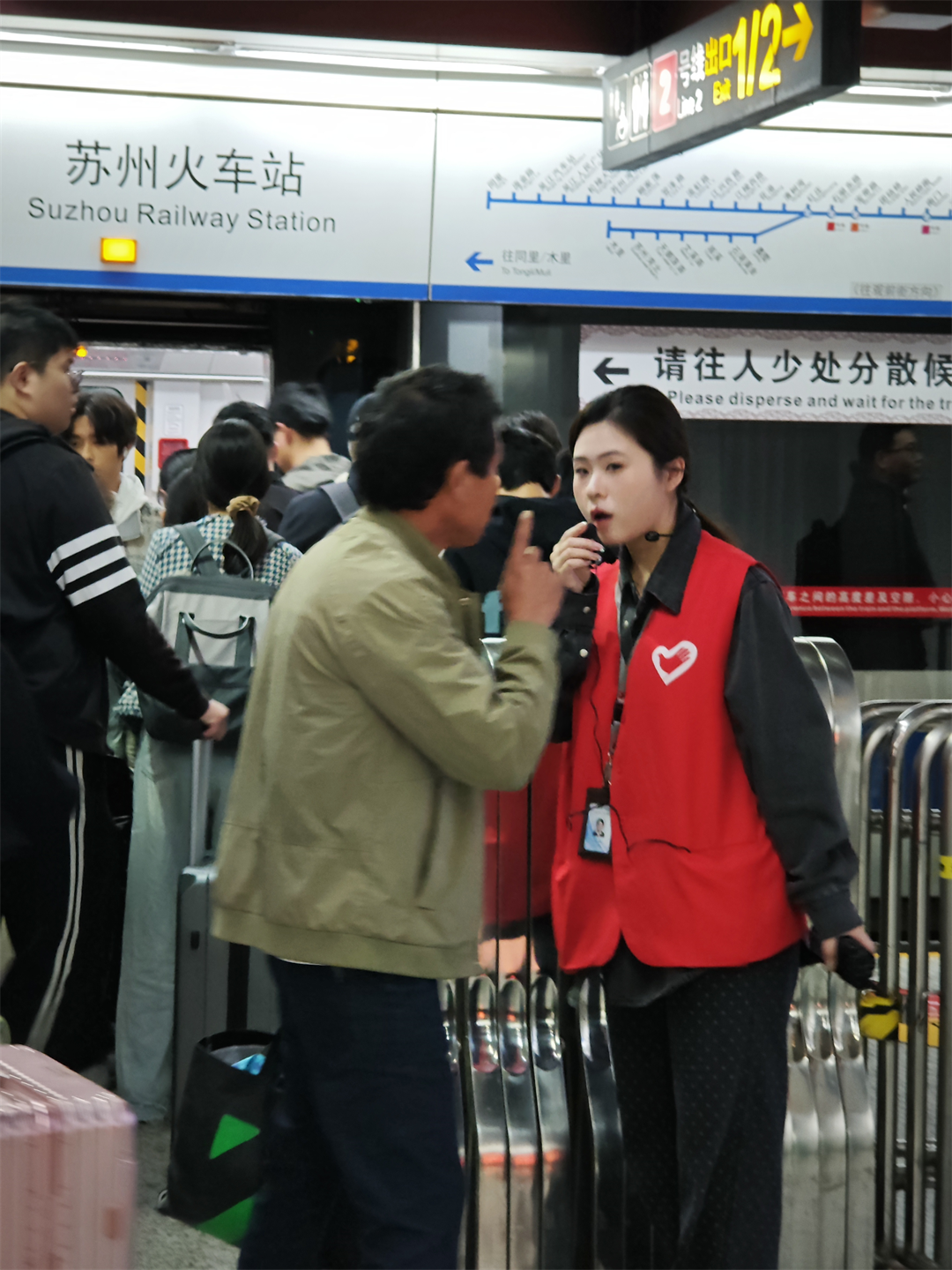 五一期间苏州站每天安排15名高校志愿者在岗,分别在进站口、电梯口、服务台周边和自助售取票机等场所,为旅客提供路线指引、问询解答、行李搬运、帮助购票等服务。
